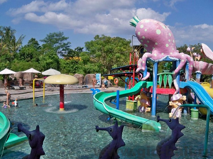 В аквапарке и на аттракционах понравится в первую очередь детям. Там есть несколько детских и взрослых горок, карусели, качели, машинки и другие аттракционы, вплоть до водных круизов. На время купания вы сможете сдать свои вещи в камеру хранения. Посещение аквапарка оплачивается отдельно и стоит 25 000 IDR/чел