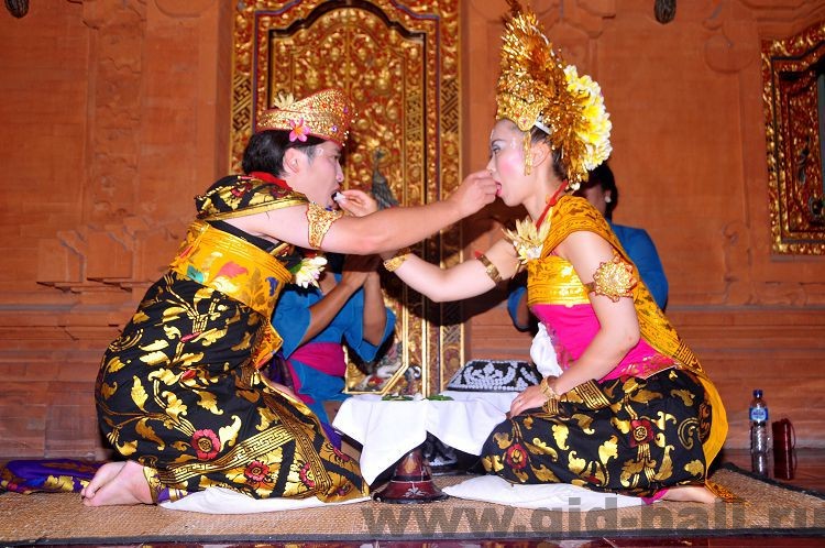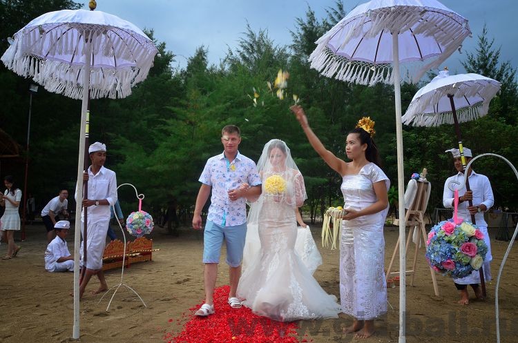 На пляже влюблённых встречают девушки в национальных балийских костюмах и под сопровождение музыкантов ведут к месту проведения церемонии. - Возле цветочной арки священник прочитает молитвы и благословит влюблённые сердца. Молодые обменяются кольцами и произнесут клятву верности друг другу.
