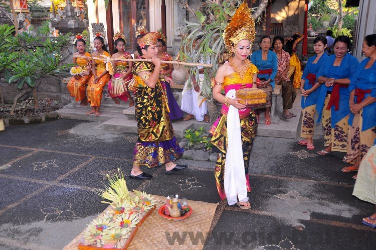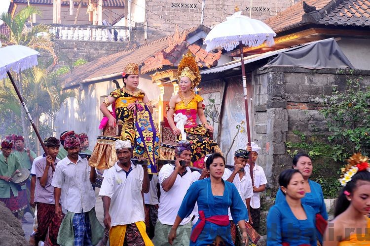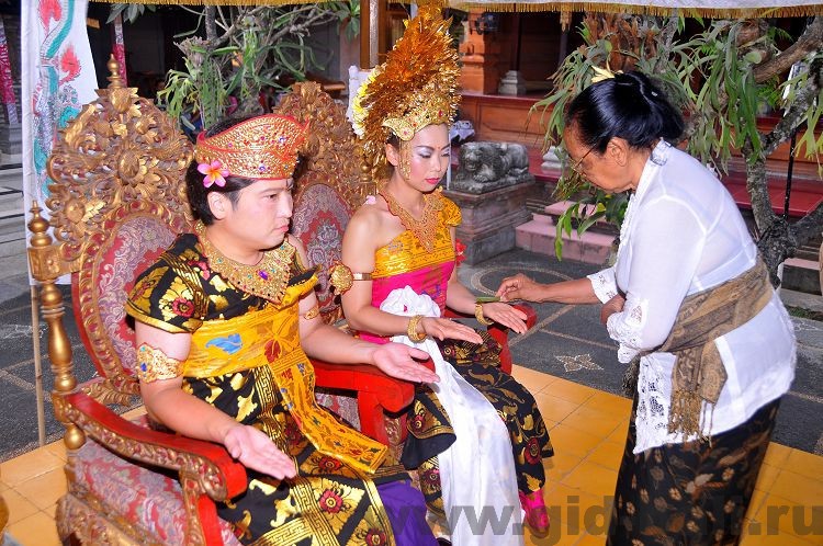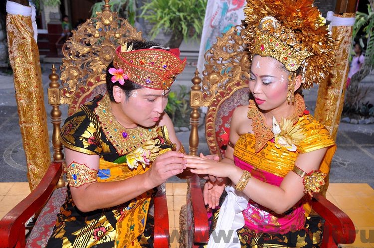 - В деревне, во дворце Пури Тегал Джая, балийские визажисты делают жениху и невесте макияж и одевают в традиционные балийские свадебные одежды. Эта церемония называется «облачение».